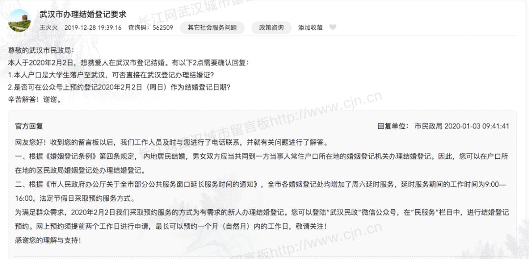 對此,武漢市民政局回應(yīng)稱:2020年2月2日,我們會(huì)根據(jù)市政府要求,采取預(yù)約服務(wù)的方式為有需求的新人辦理結(jié)婚登記。