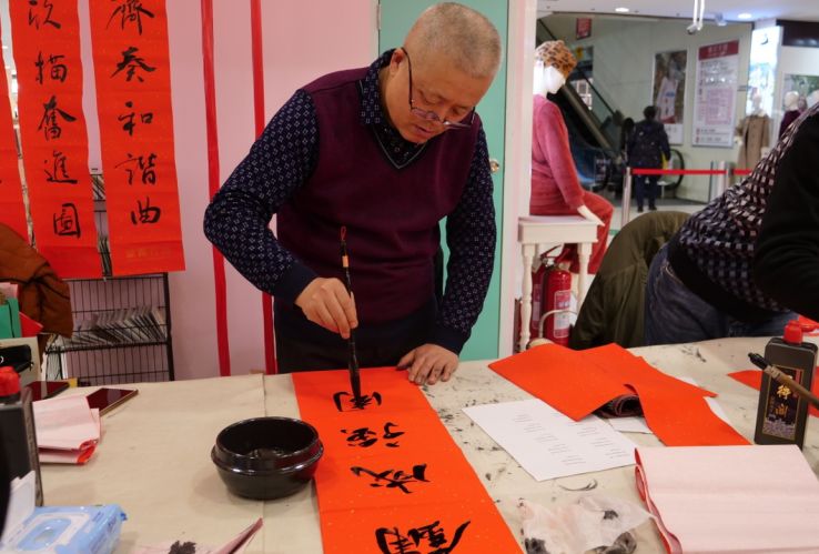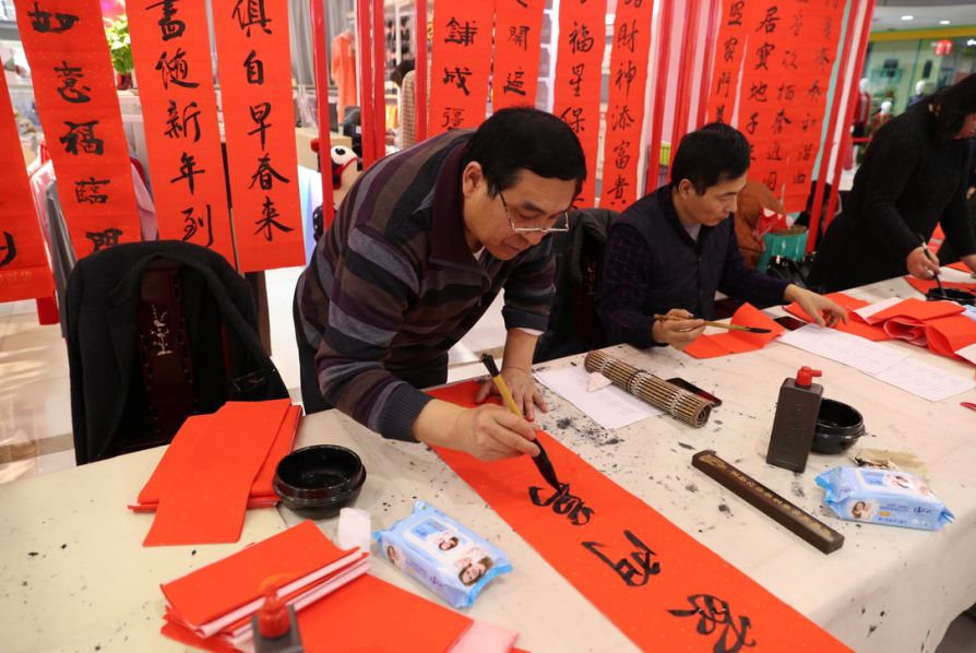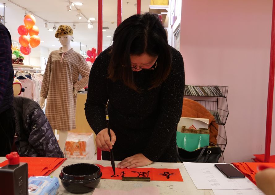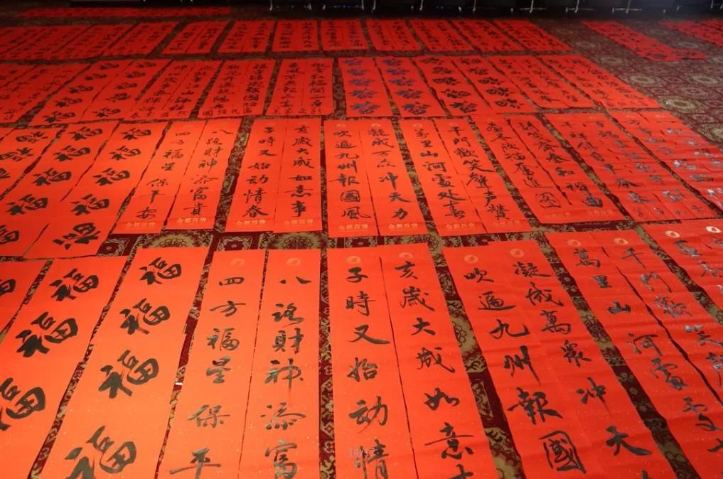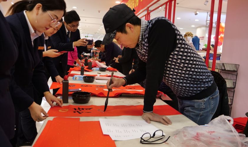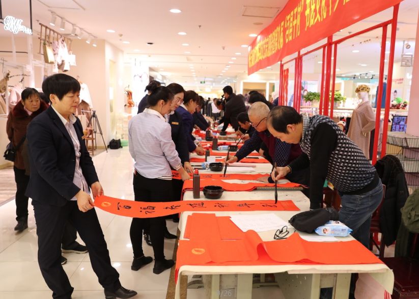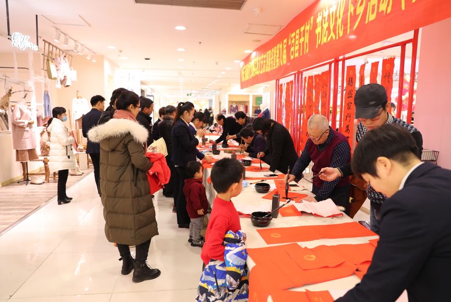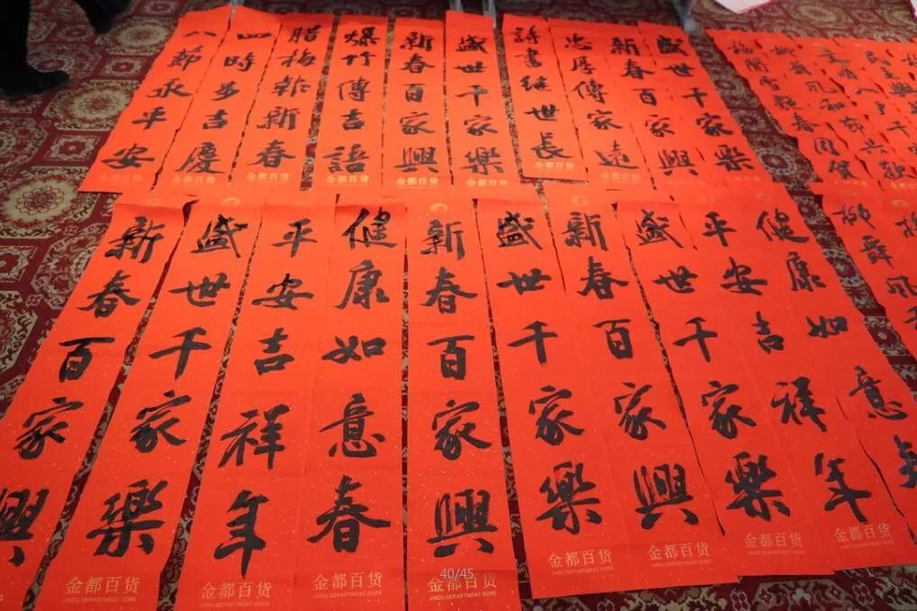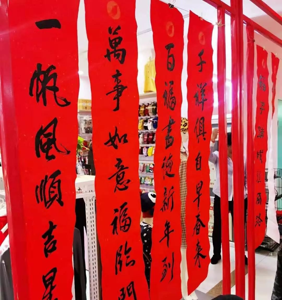 啟動儀式當(dāng)天,書法家們寫200多幅春聯(lián)現(xiàn)場贈送給顧客。