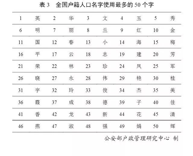 全國戶籍人口中,使用頻率最高的10個姓名依次為:“張偉”“王偉”“李娜”“王芳”“李偉”“王靜”“李靜”“張敏”“劉偉”“張靜”。這些姓名男女皆有使用。