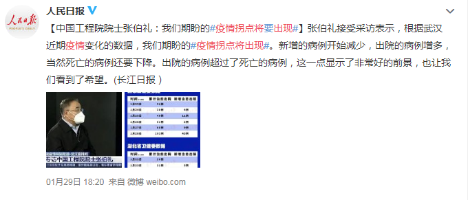 據(jù)@人民日報(bào)29日報(bào)道,中國工程院院士張伯禮接受采訪表示,根據(jù)武漢近期疫情變化的數(shù)據(jù),我們期盼的疫情拐點(diǎn)將出現(xiàn)。新增的病例開始減少,出院的病例增多,當(dāng)然死亡的病例還要下降。出院的病例超過了死亡的病例,這一點(diǎn)顯示了非常好的前景,也讓我們看到了希望。