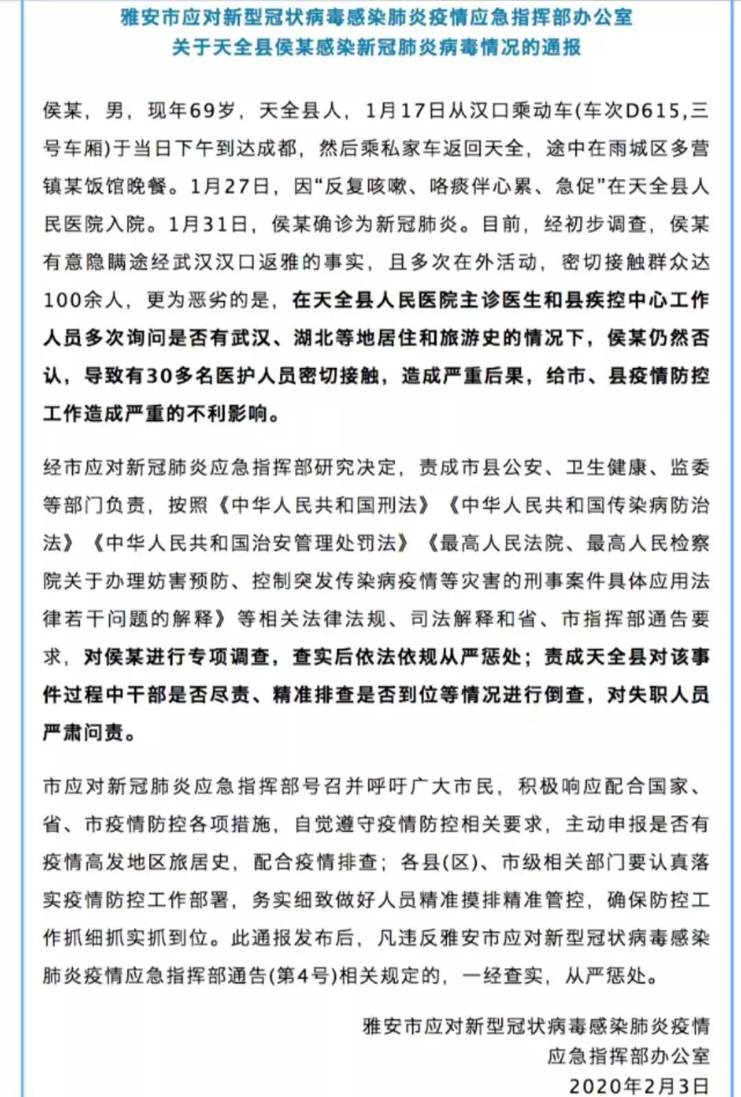 2月3日,四川雅安發(fā)布通報(bào),69歲男子侯某有意隱瞞途經(jīng)武漢漢口返回雅安的事實(shí),且多次在外活動(dòng),密切接觸群眾達(dá)100余人。