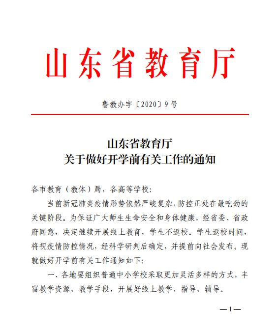 剛剛,山東省教育廳印發(fā)《關(guān)于做好開學(xué)前有關(guān)工作的通知》,決定繼續(xù)開展線上教育,學(xué)生不返校。學(xué)生返校時(shí)間,將視疫情防控情況,經(jīng)科學(xué)研判后確定,并提前向社會發(fā)布。