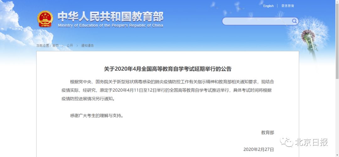 教育部網(wǎng)站2月27日發(fā)布《關(guān)于2020年4月全國(guó)高等教育自學(xué)考試延期舉行的公告》。