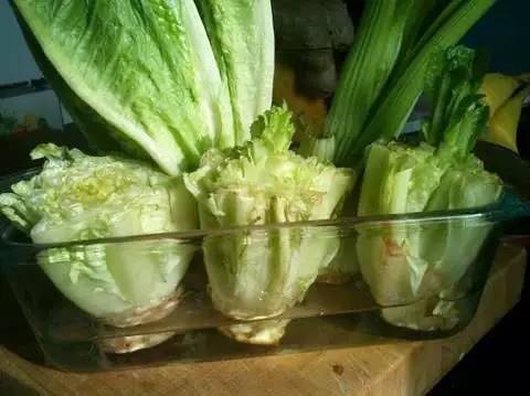 將生菜根莖放置到盛水的容器里,水位以剛漫過根部最合適,即1厘米左右。生菜很快就長高長大了。