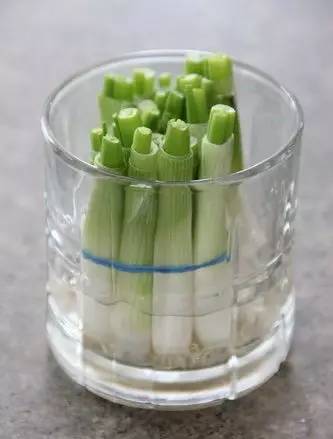 將蔥的根部自莖葉泛青的位置切開,用橡皮筋捆扎在一起,放在3厘米高的水杯里。
