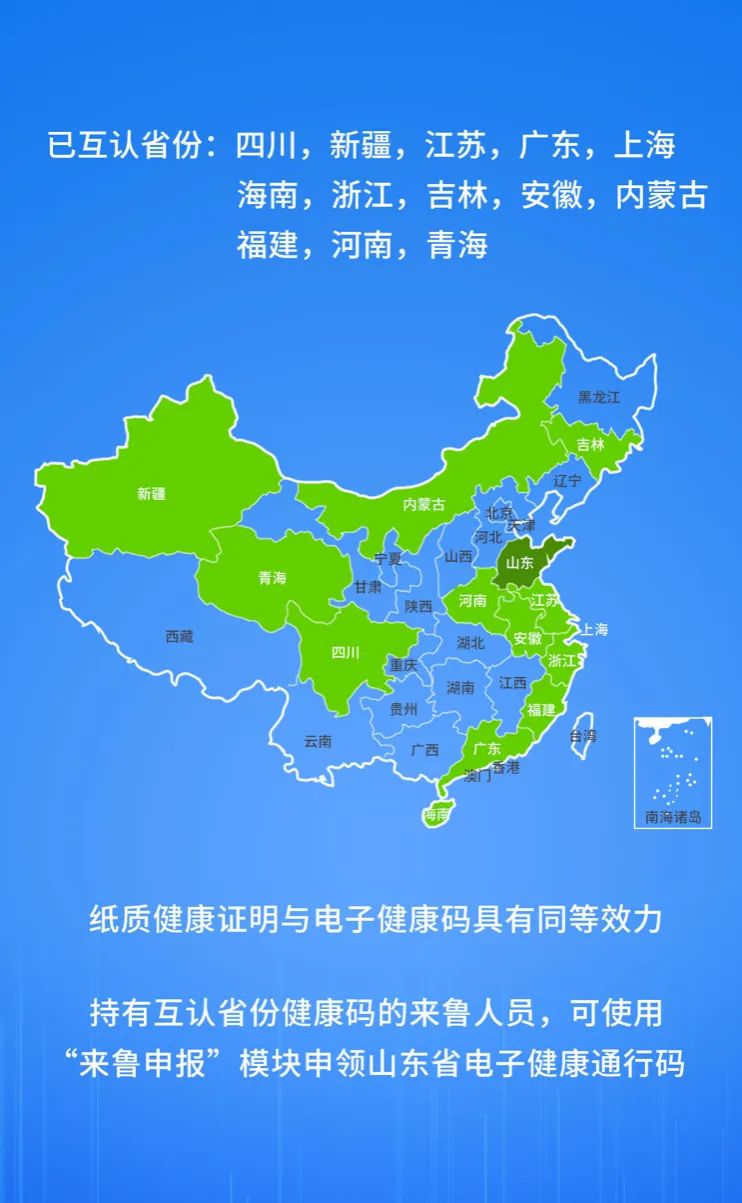 截止到3月20日晚10點(diǎn),山東“電子健康通行碼”已經(jīng)能夠與四川、新疆、江蘇、廣東、上海、海南、浙江、吉林、安徽、內(nèi)蒙古、福建、河南、青海13個(gè)?。▍^(qū)、市)互認(rèn),這就意味著,從山東出來的人員,可憑電子健康卡綠碼在上述這些地方通行。未實(shí)現(xiàn)互認(rèn)省份的來魯人員,繼續(xù)執(zhí)行隔離14天政策。待省份互認(rèn)后,持有外省健康通行綠碼或紙質(zhì)健康證明的,可直接憑碼(卡)出行,也可至“來魯申報(bào)”模塊,申領(lǐng)山東省健康綠碼后出行。
