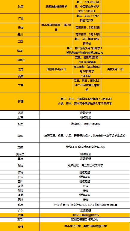 內(nèi)蒙古:高三、初三年級(jí)3月30日開(kāi)學(xué)。
