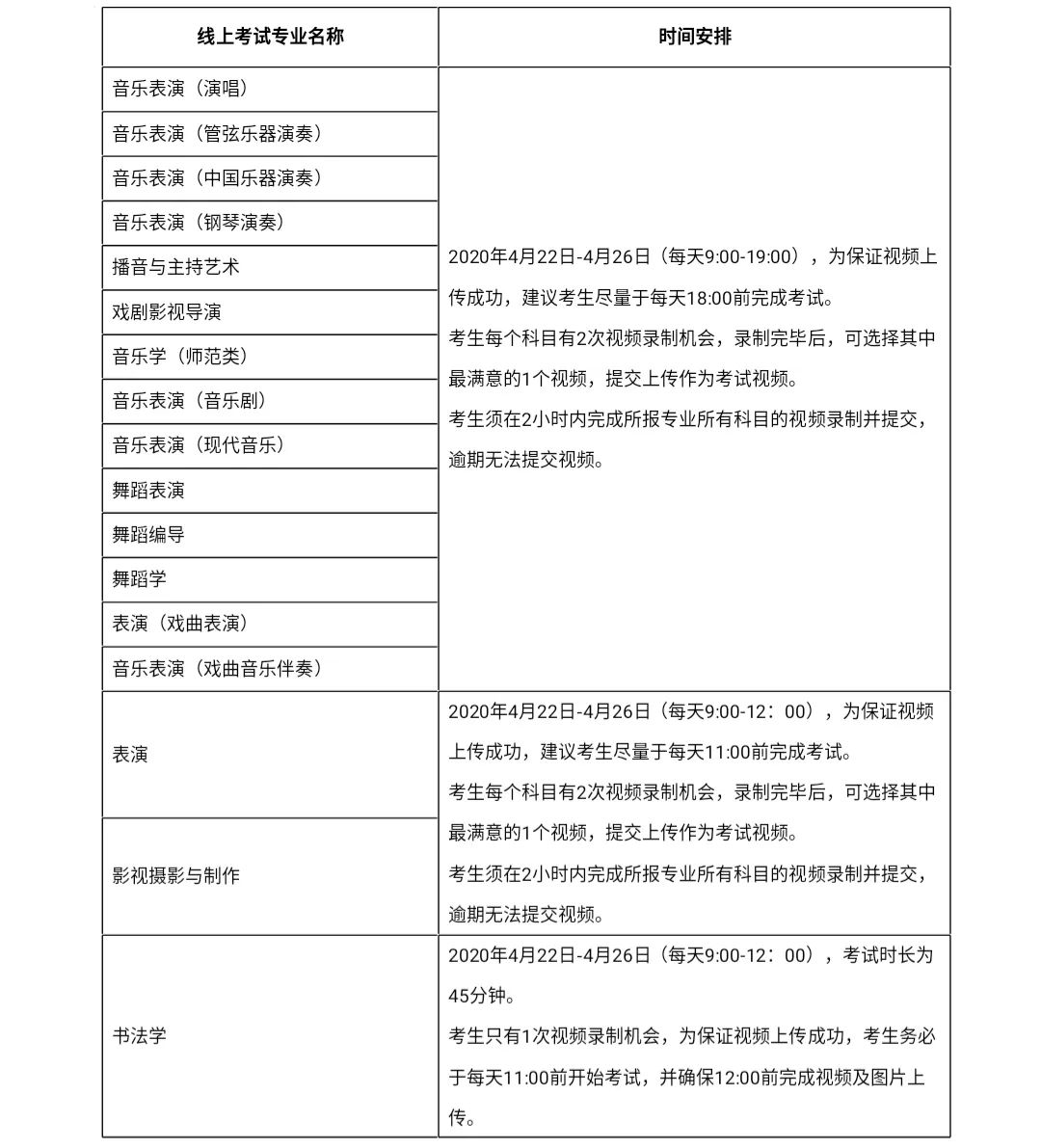 組織校考的專業(yè)均在線上完成考試,詳見下表:
