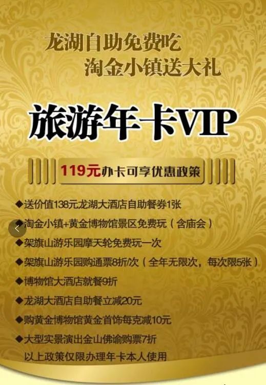 對!你沒有看錯!為了回饋廣大游客對淘金小鎮(zhèn)景區(qū)的支持,隆重推出淘金小鎮(zhèn)VIP年卡,僅需119元就可享受一次價值138元的龍湖大酒店自助餐以及全年無限次免費(fèi)游玩黃金博物館、淘金小鎮(zhèn)景區(qū)等諸多福利。快隨小編了解一下吧!