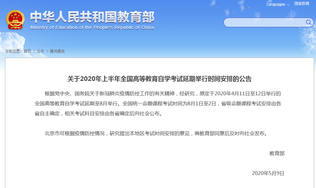根據(jù)黨中央、國務院關于新冠肺炎疫情防控工作的有關精神,經(jīng)研究,原定于2020年4月11日至12日舉行的全國高等教育自學考試延期至8月舉行。全國統(tǒng)一命題課程考試時間為8月1日至2日,省級命題課程考試安排由各省自主確定,相關考試科目安排由各省確定后向社會公布。北京市可根據(jù)疫情防控情況,研究提出本地區(qū)考試時間安排的意見,商教育部同意后及時向社會發(fā)布。