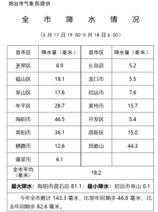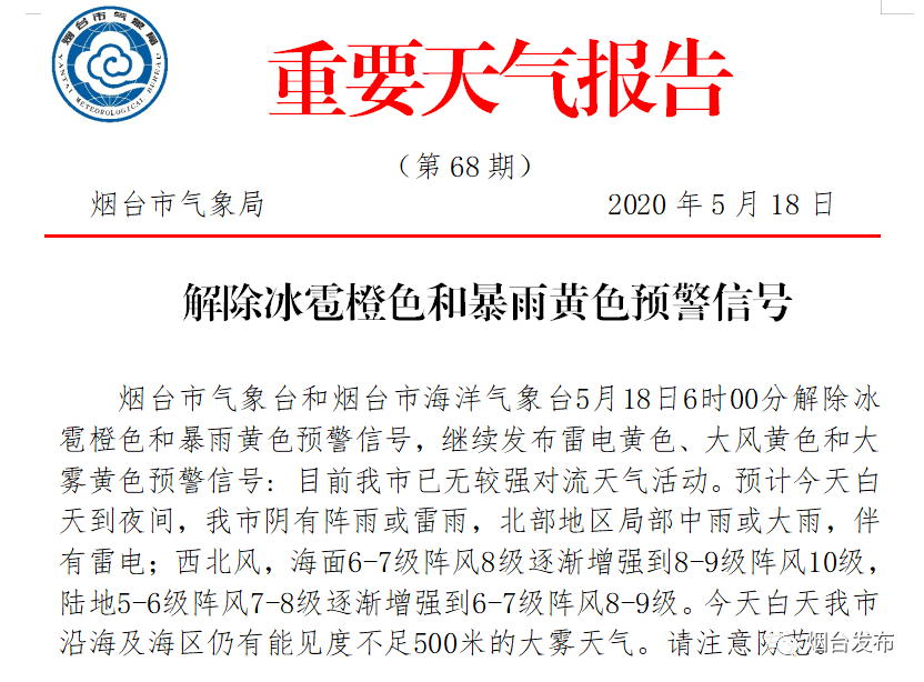 5月18日6時(shí)00分,煙臺(tái)市氣象局解除冰雹橙色和暴雨黃色預(yù)警信號(hào),繼續(xù)發(fā)布雷電黃色、大風(fēng)橙色和大霧黃色預(yù)警信號(hào)。