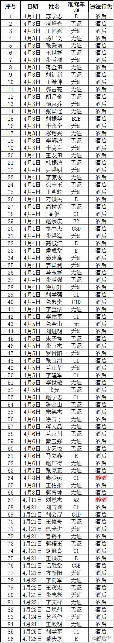 4月份酒駕、醉駕曝光表