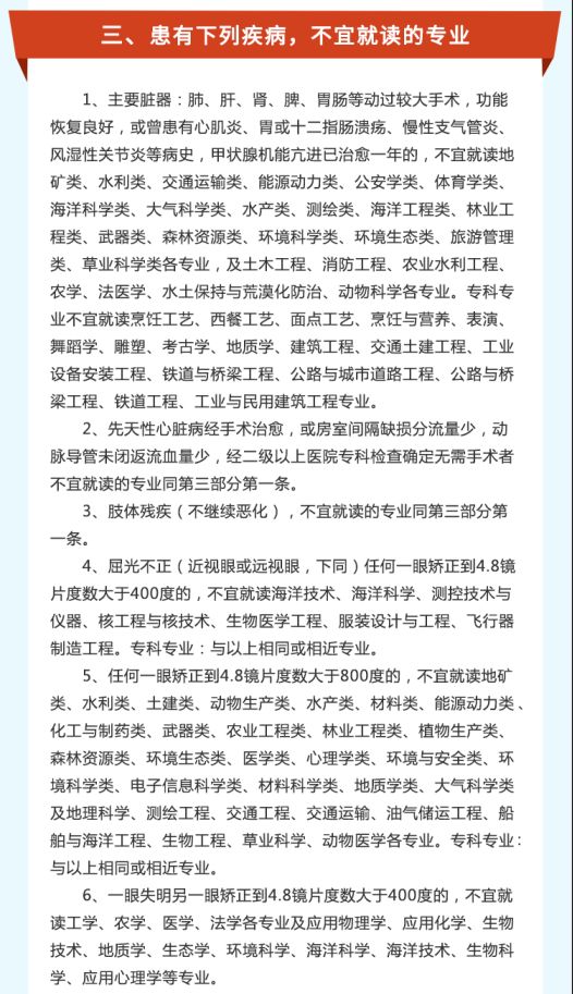 提醒考生注意的是:《指導意見》是根據(jù)高中畢業(yè)生的生理特點,體質狀況及高校各專業(yè)對考生身體條件的要求制定的。在報考志愿時,除根據(jù)各人體檢結果對照《普通高等學校招生體檢工作指導意見》相關條款的限報專業(yè)外,同時還一定要參考所報高等院?!墩猩鲁獭分袑ι眢w條件的特殊要求,避開限報專業(yè)報考,只有這樣才能正確填報志愿。