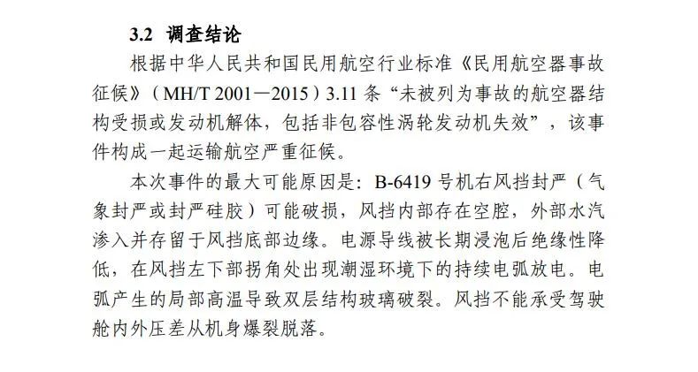 B-6419號(hào)機(jī)右風(fēng)擋封嚴(yán)(氣象封嚴(yán)或封嚴(yán)硅膠)可能破損,風(fēng)擋內(nèi)部存在空腔,外部水汽滲入并存留于風(fēng)擋底部邊緣。電源導(dǎo)線被長(zhǎng)期浸泡后絕緣性降低,在風(fēng)擋左下部拐角處出現(xiàn)潮濕環(huán)境下的持續(xù)電弧放電。電弧產(chǎn)生的局部高溫導(dǎo)致雙層結(jié)構(gòu)玻璃破裂。風(fēng)擋不能承受駕駛艙內(nèi)外壓差從機(jī)身爆裂脫落。