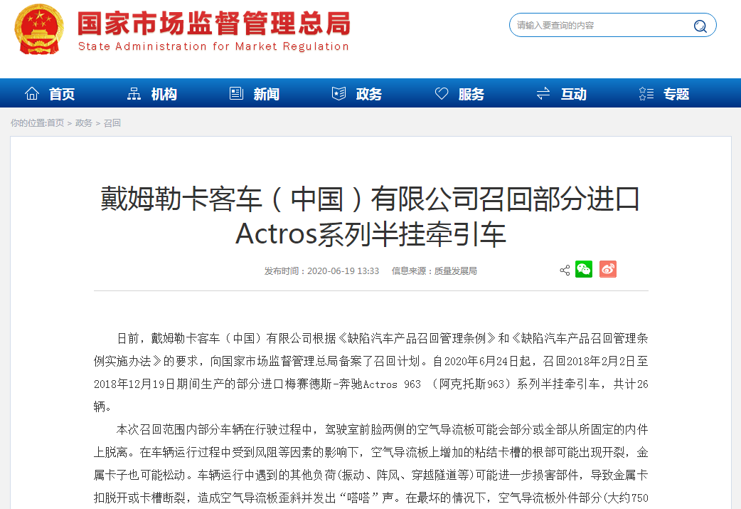 召回2019年9月19日至2019年10月9日期間生產(chǎn)的部分進(jìn)口2020年款途銳汽車,共計(jì)600臺。 召回2019年9月19日至2019年12月9日期間生產(chǎn)的部分進(jìn)口2019-2020年款奧迪Q8、A8L汽車,共計(jì)620臺。 本次召回范圍內(nèi)部分車輛由于供應(yīng)商制造過程中的偏差,變速箱油冷卻器導(dǎo)油管的焊接強(qiáng)度不達(dá)標(biāo),可能出現(xiàn)變速箱油泄漏的情況。如果變速箱油在車輛行駛過程中泄漏到路面,可能影響后車的正常駕駛;如果未能及時處理還可能導(dǎo)致變速箱損壞或車輛失去驅(qū)動力,存在安全隱患。 應(yīng)急處置措施:車輛召回維修前,用戶如果發(fā)現(xiàn)變速箱報警燈亮起應(yīng)立刻聯(lián)系授權(quán)經(jīng)銷商進(jìn)行檢查。大眾汽車(中國)銷售有限公司、一汽-大眾汽車有限公司將通過掛號信等方式通知相關(guān)車主。途銳汽車用戶可通過大眾汽車(中國)銷售有限公司客戶服務(wù)熱線:400-188-0888、奧迪Q8、A8L汽車用戶可通過一汽-大眾汽車有限公司奧迪品牌客戶服務(wù)熱線:400-817-1666,了解此次召回的詳細(xì)信息。自2020年6月24日起,戴姆勒卡客車(中國)有限公司將召回2018年2月2日至2018年12月19日期間生產(chǎn)的部分進(jìn)口梅賽德斯-奔馳Actros 963 (阿克托斯963)系列半掛牽引車,共計(jì)26輛。