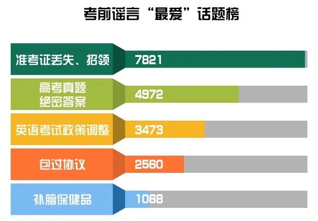 丟準(zhǔn)考證事件每年都有發(fā)生,一方面讓信息真假難辨,迷惑性強(qiáng),不少網(wǎng)民正出于善于轉(zhuǎn)發(fā),給了謠言可乘之機(jī);另一方面,其較高的出現(xiàn)頻率、舊謠新傳等特點(diǎn),也為識謠辨謠提供了契機(jī)。中國互聯(lián)網(wǎng)聯(lián)合辟謠平臺對近3年此類謠言進(jìn)行梳理,歸納出此類謠言高頻詞,看到它們,就別轉(zhuǎn)了!
