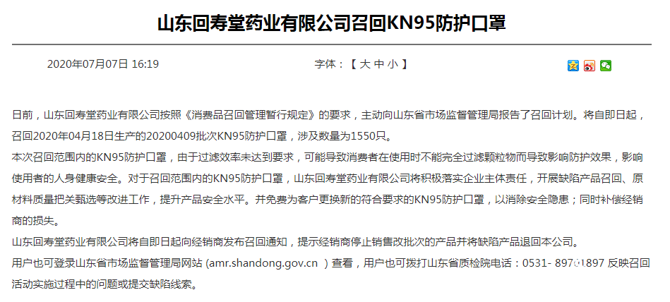 山東回壽堂藥業(yè)有限公司召回2020年04月18日生產(chǎn)的20200409批次KN95防護(hù)口罩,涉及數(shù)量為1550只。