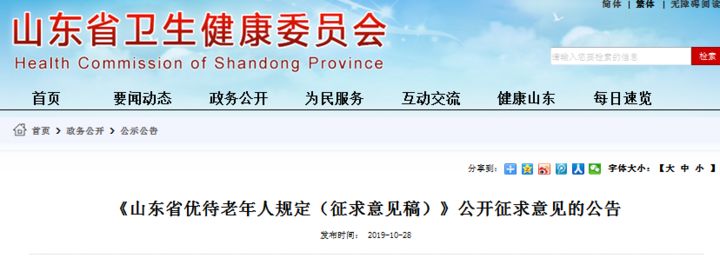 2019年10月,山東省衛(wèi)生健康委員會發(fā)布公告,向社會公開征求對《山東省優(yōu)待老年人規(guī)定(征求意見稿)》(以下稱“征求意見稿”)的意見。