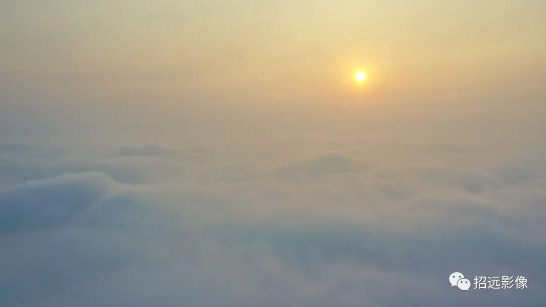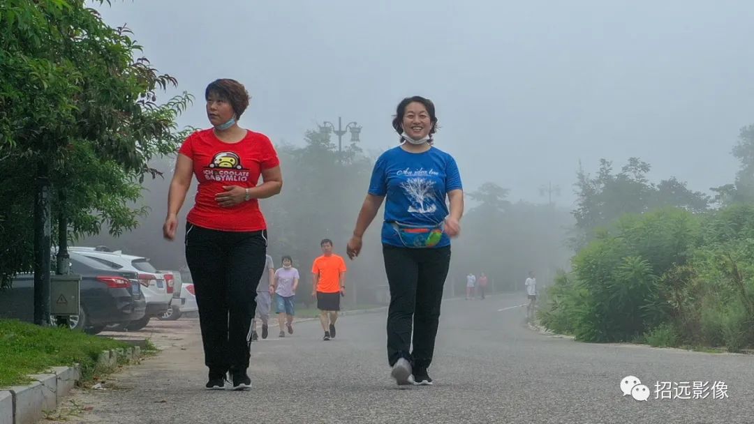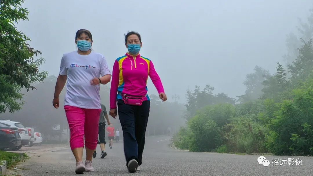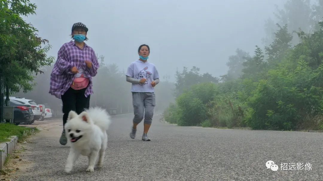 早晨霧靄沉沉,天空被濃霧籠罩。盡管高天之上,已有太陽當空,但下面厚厚的云海,使無人機飛上300米,才看到城西霧云山的山尖。在龍湖晨跑的人們在霧霾中堅持運動。