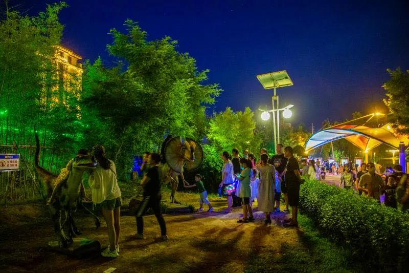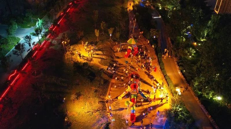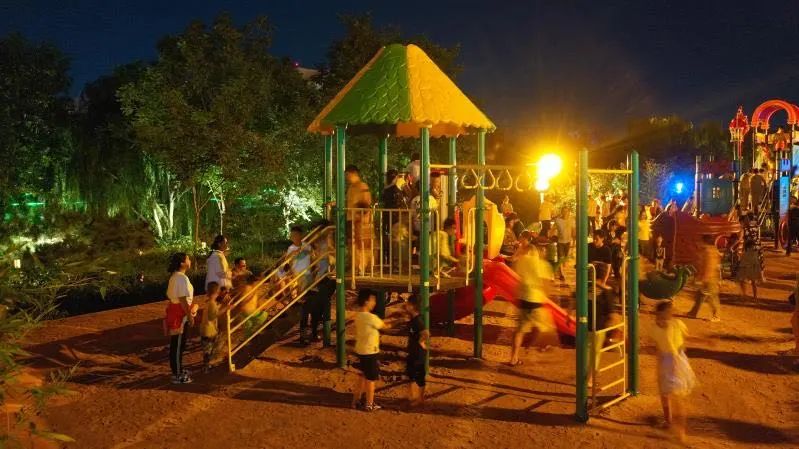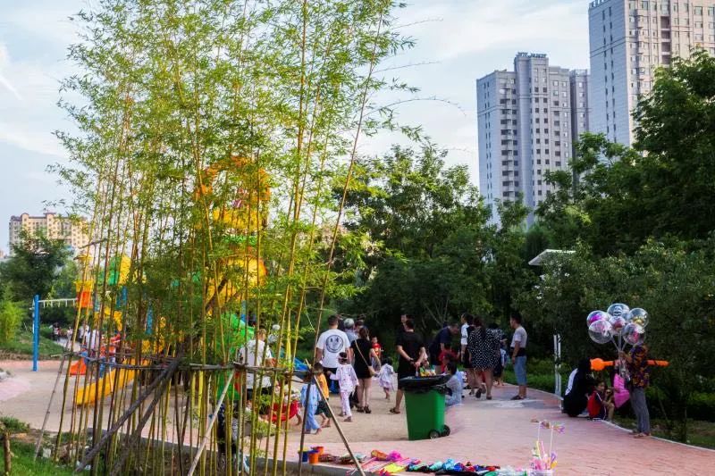 金龍河公園東側景觀路上家長和小朋友熙熙攘攘,歡聲笑語不斷