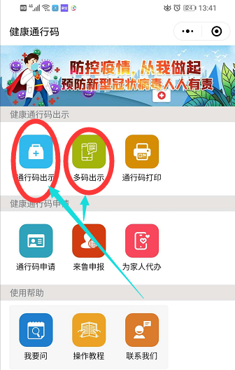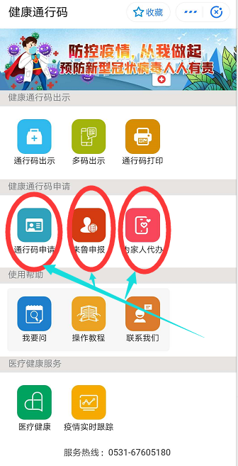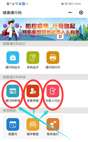 第二步 點擊防疫專區(qū)—健康通行卡,根據(jù)個人情況點擊通行碼申請(或來魯申請或為家人代辦)。