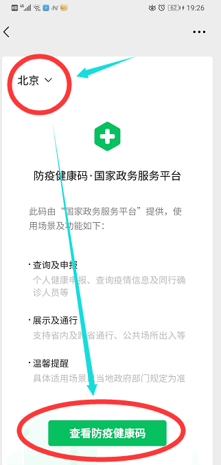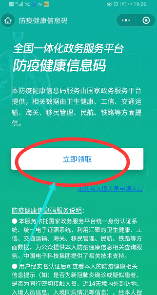 第二步 地區(qū)選擇“北京”后點擊“查看防疫健康碼”進入“全國一體化政務(wù)服務(wù)平臺”界面,點擊“立即領(lǐng)取”,按照操作提示依次進行下列步驟直至進入填寫個人信息界面。
