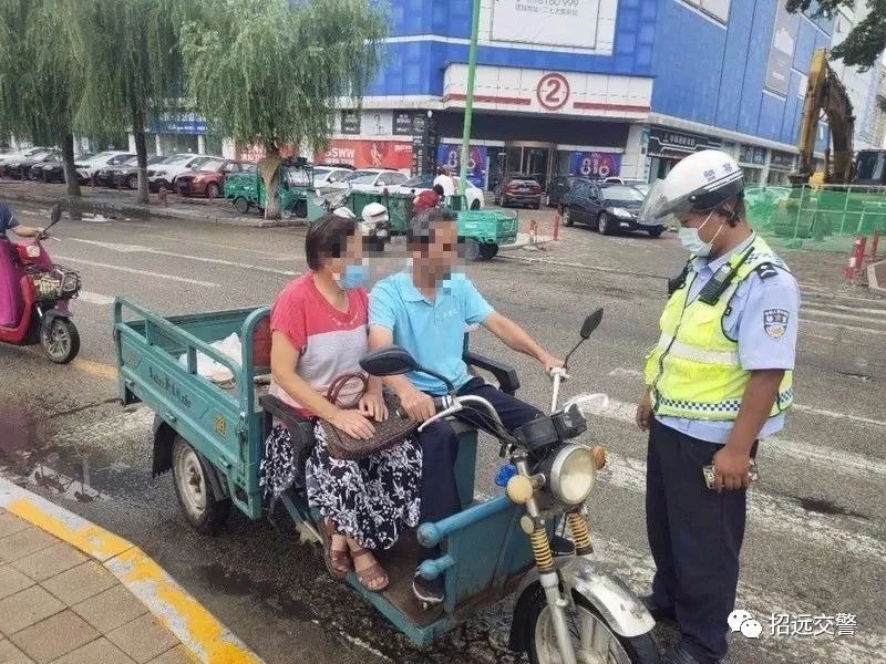 8月3日上午9時(shí)許,招遠(yuǎn)交警大隊(duì)一中隊(duì)民警在巡邏期間,在文三線西宋家路口發(fā)現(xiàn)一輛由西向東行駛的電動(dòng)三輪車(chē)存在違法載人行為,民警立即示意其停車(chē)接受檢查。