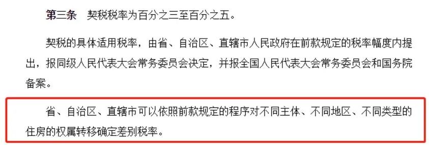 其實(shí),1997年發(fā)布的《中華人民共和國(guó)契稅暫行條例》中,早已規(guī)定契稅稅率為百分之三至百分之五。但各省市可以根據(jù)實(shí)際情況確定差別稅率。
