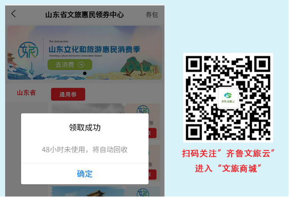 領(lǐng)取成功后,掃描二維碼,進(jìn)入“文旅商城”即可下單消費(fèi)(同一手機(jī)號登錄)。