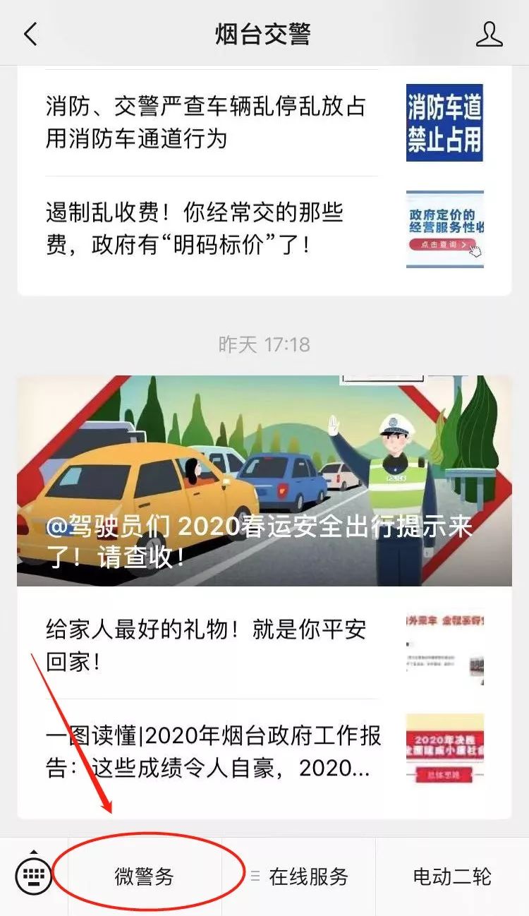 ⑴打開“煙臺(tái)交警”或“煙臺(tái)公安”微信公眾號(hào)。