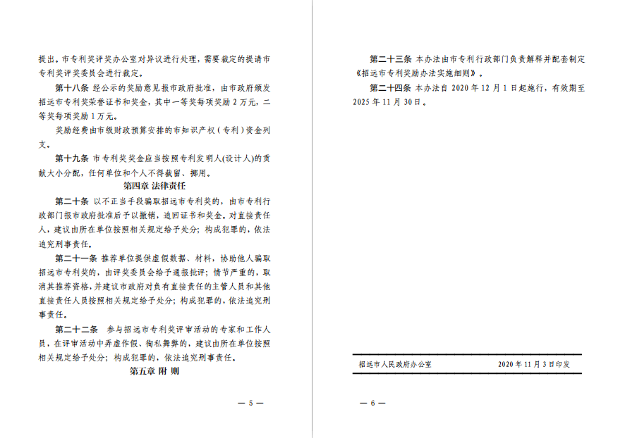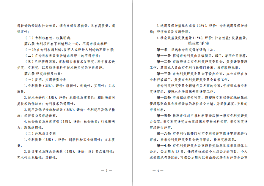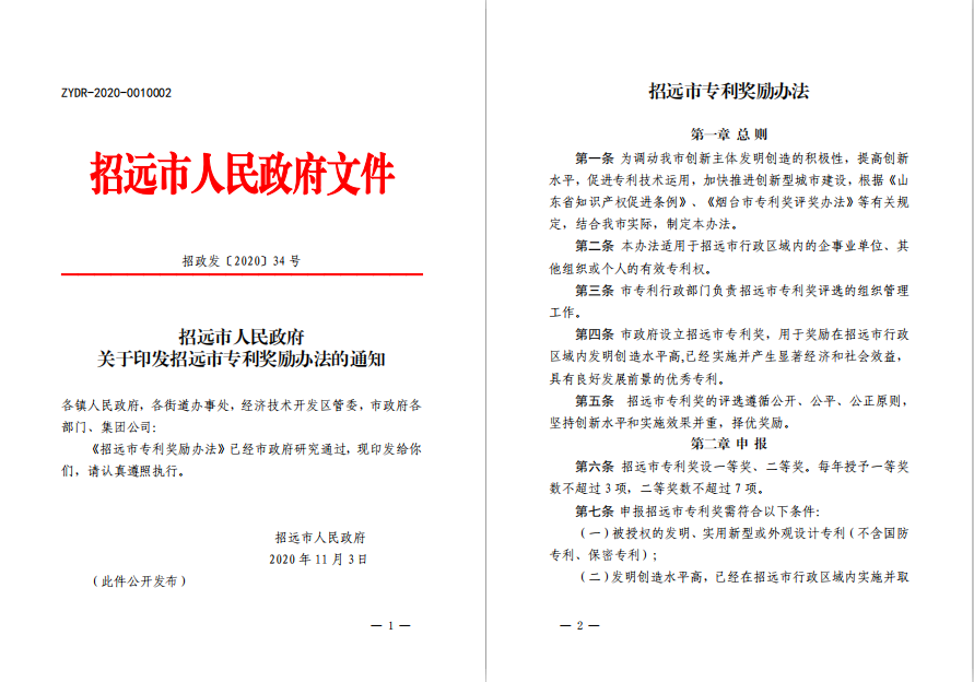 專利工作作為激勵創(chuàng)新的有力保障,在提高企業(yè)核心競爭力和推動新舊動能轉(zhuǎn)換中發(fā)揮著重要作用,對實(shí)施知識產(chǎn)權(quán)戰(zhàn)略、促進(jìn)專利技術(shù)運(yùn)用、推動全市高質(zhì)量發(fā)展具有積極的推動作用。市政府設(shè)立專利獎,用于獎勵在招遠(yuǎn)市行政區(qū)域內(nèi)發(fā)明創(chuàng)造水平高,已經(jīng)實(shí)施并產(chǎn)生顯著經(jīng)濟(jì)和社會效益,具有良好發(fā)展前景的優(yōu)秀專利。