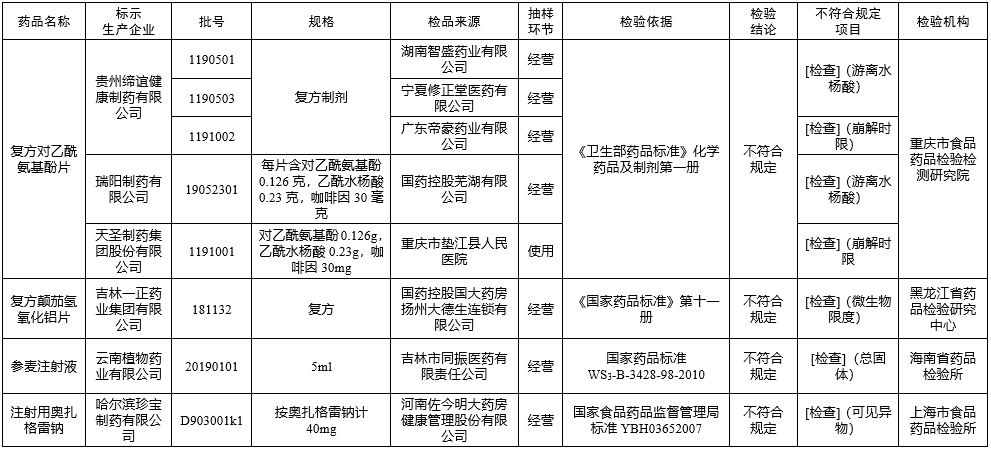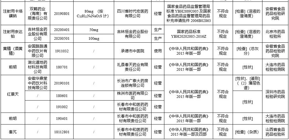重慶市食品藥品檢驗(yàn)檢測(cè)研究院檢驗(yàn)。標(biāo)示為吉林一正藥業(yè)集團(tuán)有限公司生產(chǎn)的1批次復(fù)方顛茄氫氧化鋁片不符合規(guī)定,不符合規(guī)定項(xiàng)目為微生物限度。黑龍江省藥品檢驗(yàn)研究中心檢驗(yàn)。標(biāo)示為云南植物藥業(yè)有限公司生產(chǎn)的1批次參麥注射液不符合規(guī)定,不符合規(guī)定項(xiàng)目為總固體。標(biāo)示為哈爾濱珍寶制藥有限公司生產(chǎn)的1批次注射用奧扎格雷鈉不符合規(guī)定,不符合規(guī)定項(xiàng)目為可見(jiàn)異物。標(biāo)示為雙鶴藥業(yè)(海南)有限責(zé)任公司生產(chǎn)的1批次注射用卡絡(luò)磺鈉不符合規(guī)定,不符合規(guī)定項(xiàng)目為溶液的澄清度。安徽省食品藥品檢驗(yàn)研究院檢驗(yàn)。標(biāo)示為吉林恒金藥業(yè)股份有限公司生產(chǎn)的2批次注射用奈達(dá)鉑不符合規(guī)定,不符合規(guī)定項(xiàng)目為溶液的澄清度。標(biāo)示為安國(guó)路路通中藥飲片有限公司生產(chǎn)的1批次黃精(酒黃精)不符合規(guī)定,不符合規(guī)定項(xiàng)目為總灰分。安徽省食品藥品檢驗(yàn)研究院檢驗(yàn)。標(biāo)示為湖北道地藥材科技有限公司生產(chǎn)的1批次前胡不符合規(guī)定,不符合規(guī)定項(xiàng)目為性狀。大連市藥品檢驗(yàn)檢測(cè)院檢驗(yàn)。標(biāo)示為安徽華鼎堂中藥飲片科技有限公司生產(chǎn)的1批次紅景天不符合規(guī)定,不符合規(guī)定項(xiàng)目包括性狀、鑒別。抽取自株洲市醫(yī)藥有限公司的1批次紅景天不符合規(guī)定,不符合規(guī)定項(xiàng)目為性狀。