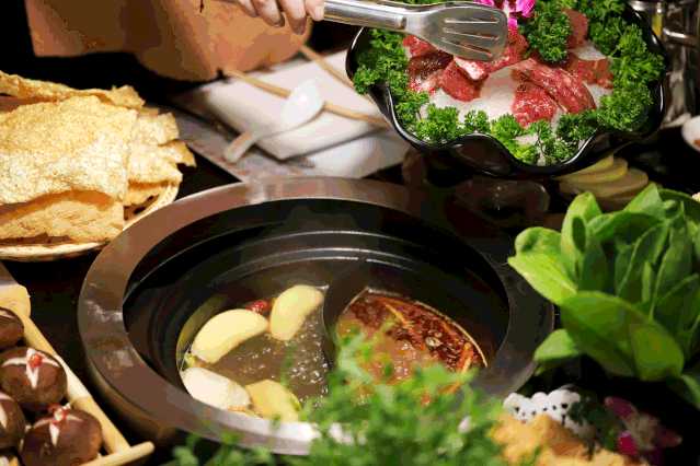 店里有蟲(chóng)草花菌王鍋底、香辣川派鍋底、麻辣紅牛油鍋底、養(yǎng)顏番茄鍋底、開(kāi)胃酸辣鍋底5種口味,可以試試混搭雙拼鍋,一次吃到兩個(gè)味道!