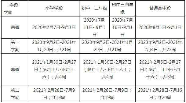 (一)義務(wù)教育階段學(xué)校。寒假2021年1月30日(農(nóng)歷臘月十八,星期六)至2月28日(農(nóng)歷正月十七,星期日),3月1日(農(nóng)歷正月十八,星期一)開學(xué);暑假7月7日至8月31日,9月1日(星期三)開學(xué)。寄宿制學(xué)校可提前一天安排學(xué)生報(bào)到。(二)普通高中學(xué)校。寒假2021年2月6日(農(nóng)歷臘月廿五,星期六)至2月28日(農(nóng)歷正月十七,星期日),3月1日(農(nóng)歷正月十八,星期一)開學(xué);暑假7月14日至8月31日,9月1日(星期三)開學(xué)。寄宿制學(xué)??商崆耙惶彀才艑W(xué)生報(bào)到。為規(guī)范全市中小學(xué)辦學(xué)行為,保障師生的合法休息權(quán)益,保證中小學(xué)生度過健康、安全、文明而有意義的假期,根據(jù)省教育廳有關(guān)規(guī)定,結(jié)合我市教育工作實(shí)際,現(xiàn)就2021年我市中小學(xué)假期安排等有關(guān)事宜通知如下。義務(wù)教育階段學(xué)校寒假時(shí)間為4周,暑假時(shí)間為8周;普通高中寒假時(shí)間為3周,暑假時(shí)間為7周。縣域義務(wù)教育階段學(xué)校具體放假起止時(shí)間由各縣市根據(jù)實(shí)際情況自行確定。全市普通高中和市區(qū)義務(wù)教育階段學(xué)校放假時(shí)間根據(jù)市教育局要求統(tǒng)一執(zhí)行。1.寒假時(shí)間:市區(qū)義務(wù)教育階段學(xué)校寒假開始時(shí)間為2021年1月30日(農(nóng)歷2020年臘月十八,周六),全市普通高中為2021年2月6日(農(nóng)歷2020年臘月二十五,周六)。開學(xué)時(shí)間為2021年2月28日(農(nóng)歷2021年正月十七,周日),寄宿制學(xué)??商崆耙惶彀才艑W(xué)生報(bào)到。2020-2021學(xué)年度第二學(xué)期,市區(qū)義務(wù)教育階段學(xué)校為2021年2月28日至7月6日,全市普通高中學(xué)校為2021年2月28日至7月13日。2.暑假時(shí)間:市區(qū)義務(wù)教育階段學(xué)校暑假開始時(shí)間為2021年7月7日,全市普通高中為2021年7月14日。秋季學(xué)期開學(xué)時(shí)間為9月1日,寄宿制學(xué)??商崆耙惶彀才艑W(xué)生報(bào)到。2021-2022學(xué)年度第一學(xué)期,市區(qū)義務(wù)教育階段學(xué)校為2021年9月1日——2022年1月18日,普通高中學(xué)校為2021年9月1日——2022年1月25日。3.公共節(jié)假日安排:原則上按照國家有關(guān)規(guī)定執(zhí)行,無特殊情況不再另行通知。因故需要調(diào)整節(jié)假日安排,以及因高中學(xué)業(yè)水平考試、高考和中考等考試而耽誤的學(xué)生正常上課時(shí)間,可按照對等時(shí)間進(jìn)行調(diào)整,須至少提前3天按審批權(quán)限報(bào)上級教育行政部門同意后方可進(jìn)行調(diào)整,調(diào)整方案確定后要提前向?qū)W生、家長和社會(huì)公布。各縣市區(qū)教育和體育局,各功能區(qū)教育部門,市直各中小學(xué)校、幼兒園:為維護(hù)正常教育教學(xué)秩序,確保廣大師生度過健康、安全、有意義的假期,根據(jù)省教育廳關(guān)于中小學(xué)假期安排工作要求,結(jié)合實(shí)際,現(xiàn)將2021年全市中小學(xué)假期安排有關(guān)工作通知如下:公共節(jié)假日安排,原則上按照國家有關(guān)規(guī)定執(zhí)行。義務(wù)教育階段學(xué)校寒假為4周,時(shí)間為2021年1月29日至2月28日(農(nóng)歷2020年臘月十七至2021年正月十七),3月1日(農(nóng)歷2021年正月十八)開學(xué);暑假為8周,時(shí)間為2021年7月4日至8月30日,8月31日報(bào)到,9月1日開學(xué)。普通高中寒假為3周,時(shí)間為2021年2月5日至2月28日(農(nóng)歷2020年臘月廿四至2021年正月十七),3月1日(農(nóng)歷2021年正月十八)開學(xué);暑假為7周,時(shí)間為2021年7月11日至8月30日,8月31日報(bào)到,9月1日開學(xué)。因高、初中學(xué)業(yè)水平考試和高考等原因影響的正常上課時(shí)間,由我局統(tǒng)一按照對等時(shí)間進(jìn)行調(diào)整。未經(jīng)我局同意,嚴(yán)禁任何單位和個(gè)人更改假期時(shí)間安排。特殊情況須報(bào)經(jīng)我局審核、省教育廳批準(zhǔn)后方可調(diào)整。關(guān)于2021年中小學(xué)假期安排有關(guān)工作的各縣區(qū)教體局,市開發(fā)區(qū)、高新區(qū)社會(huì)發(fā)展局,市直各中小學(xué):根據(jù)省教育廳假期安排有關(guān)要求,結(jié)合我市實(shí)際和傳統(tǒng)節(jié)日時(shí)間,現(xiàn)就2021年全市普通中小學(xué)假期時(shí)間安排有關(guān)工作通知如下。(一)寒假:義務(wù)教育階段學(xué)校具體時(shí)間為2021年1月30日(臘月十八)至2月28日(正月十七),3月1日(正月十八)開學(xué);普通高中學(xué)校具體時(shí)間為2021年2月6日(臘月廿五)至2月28日(正月十七),3月1日(正月十八)開學(xué)。(二)暑假:義務(wù)教育階段學(xué)校具體時(shí)間為2021年7月2日至8月29日,8月30日開學(xué);普通高中學(xué)校具體時(shí)間為2021年7月8日至8月29日,8月30日開學(xué)。(三)公共節(jié)假日:原則上按照國務(wù)院辦公廳關(guān)于2021年部分節(jié)假日安排的通知執(zhí)行。(四)因特殊情況需要調(diào)整寒暑假安排的縣區(qū),須提前按規(guī)定程序?qū)徟蛡浒?。?yán)禁隨意增減假期時(shí)間。學(xué)校因?qū)W業(yè)水平考試、中考和高考等設(shè)置考點(diǎn)考試、寄宿制、農(nóng)忙假期等原因確需調(diào)整的,可結(jié)合實(shí)際安排調(diào)休,但調(diào)休時(shí)間要保證國家規(guī)定的放假天數(shù),調(diào)休的時(shí)間安