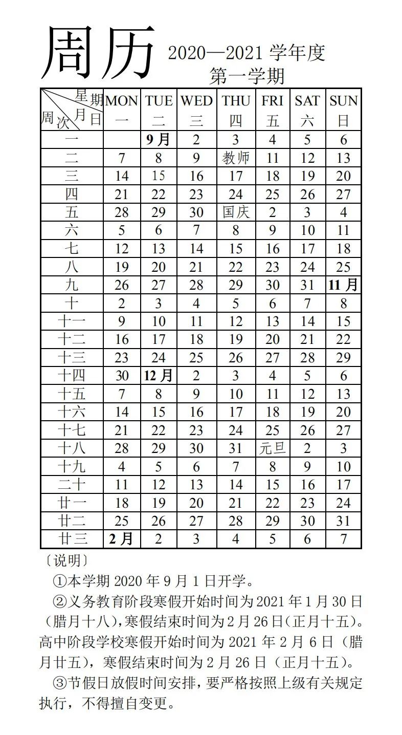 根據(jù)省教育廳假期安排有關(guān)要求,結(jié)合我市實(shí)際以及傳統(tǒng)節(jié)日時(shí)間,現(xiàn)將2021年煙臺(tái)市普通中小學(xué)假期時(shí)間安排通知如下:2020—2021學(xué)年度,我市義務(wù)教育階段學(xué)校寒假放假時(shí)間為:2021年1月25日(農(nóng)歷臘月十三)至2月28日(正月十七),3月1日開學(xué)。普通高中學(xué)校寒假放假時(shí)間為2021年2月4日(農(nóng)歷臘月二十三)至2月27日(正月十六),2月28日開學(xué)。我市義務(wù)教育階段學(xué)校和普通高中學(xué)校暑假放假時(shí)間統(tǒng)一安排為2021年7月12日至8月29日,8月30日開學(xué)。因特殊情況需要調(diào)整寒暑假期安排的區(qū)市,須提前按規(guī)定程序?qū)徟蛡浒浮?/span>2021年,全市中小學(xué)公共節(jié)假日安排原則上按照國家有關(guān)規(guī)定執(zhí)行,各區(qū)市教體局可結(jié)合實(shí)際對寄宿制學(xué)校統(tǒng)一安排調(diào)休時(shí)間,直屬普通高中學(xué)校可結(jié)合實(shí)際安排調(diào)休,但調(diào)休時(shí)間要保證國家規(guī)定的放假天數(shù),調(diào)休的時(shí)間安排應(yīng)提前向社會(huì)公示并按規(guī)定程序?qū)徟蛡浒?。因?qū)W業(yè)水平考試、中考和高考等原因影響的正常上課時(shí)間,由區(qū)市教體局、直屬有關(guān)學(xué)校統(tǒng)一進(jìn)行調(diào)整并報(bào)市教育局審核、備案。附:山東其他地方已公布的中小學(xué)寒假時(shí)間:寒假安排:義務(wù)教育階段學(xué)校寒假開始時(shí)間為2021年1月30日(臘月十八),寒假結(jié)束時(shí)間為2月26日(正月十五)。高中階段學(xué)校寒假開始時(shí)間為2021年2月6日(臘月廿五),寒假結(jié)束時(shí)間為2月26日(正月十五)。根據(jù)最新校歷安排,2021年2月28日(星期日)義務(wù)教育學(xué)校、普通高中、中等職業(yè)學(xué)校學(xué)生報(bào)到,3月1日(星期一)義務(wù)教育學(xué)校、普通高中、中等職業(yè)學(xué)校學(xué)生上課;7月5日(星期一)義務(wù)教育學(xué)校學(xué)生暑假開始,7月12日(星期一)普通高中、中等職業(yè)學(xué)校學(xué)生暑假開始。按照今年6月市教育局發(fā)布的2020-2021學(xué)年度第一學(xué)期校歷,2021年2月1日義務(wù)教育學(xué)校學(xué)生寒假開始,2月4日普通高中、中等職業(yè)學(xué)校學(xué)生寒假開始。如此計(jì)算,義務(wù)教育學(xué)校學(xué)生寒假共計(jì)27天(報(bào)到日不計(jì)入),普通高中、中等職業(yè)學(xué)校學(xué)生寒假共計(jì)24天(報(bào)到日不計(jì)入)。根據(jù)《關(guān)于2020-2021學(xué)年度全市普通中小學(xué)教學(xué)時(shí)間及寒暑假期安排的通知》安排如下:小學(xué)初中:2021年1月30日至2月28日