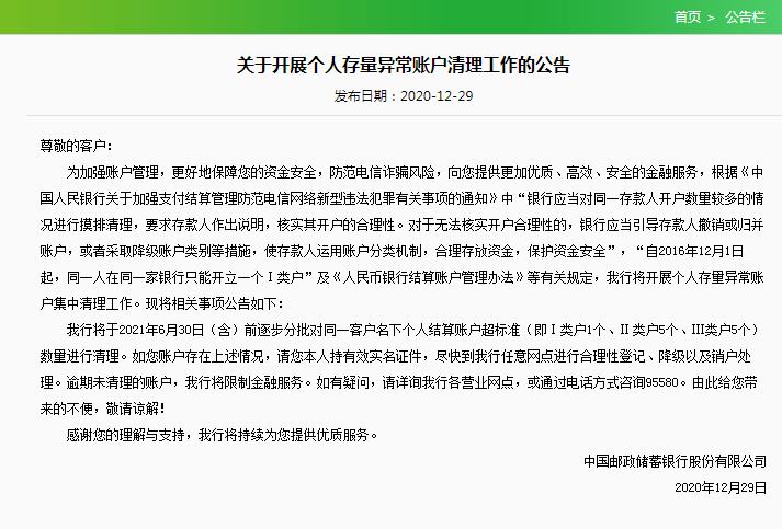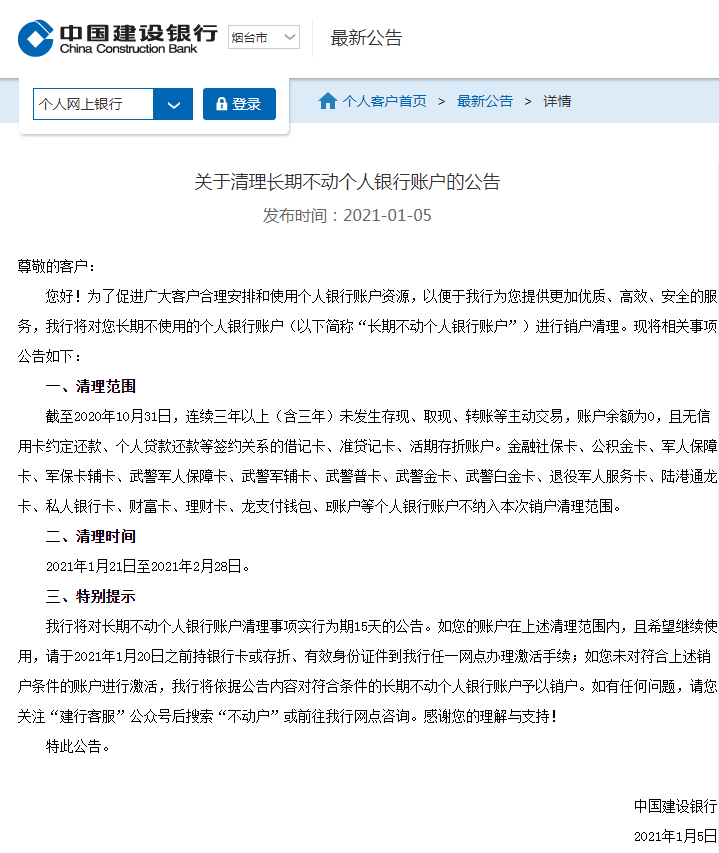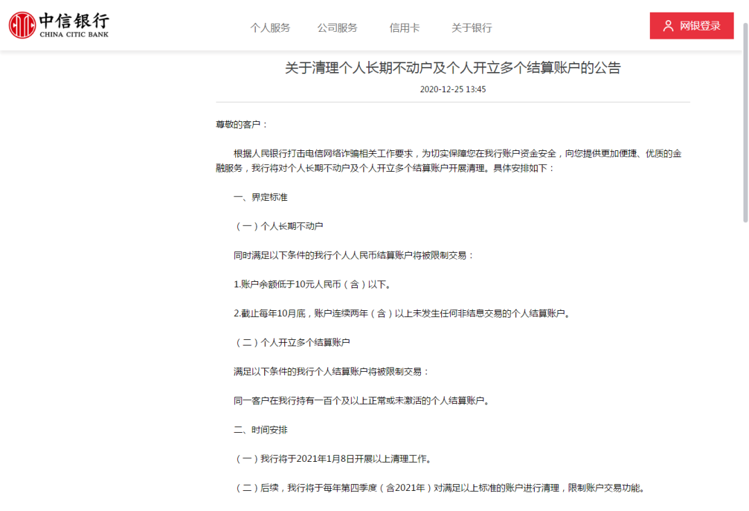 將于2021年1月8日起,對(duì)賬戶余額低于10元人民幣(含)以下,以及截止每年10月底,賬戶連續(xù)兩年(含)以上未發(fā)生任何非結(jié)息交易的個(gè)人結(jié)算賬戶展開(kāi)清理工作。同一客戶在中信銀行持有一百個(gè)及以上正?;蛭醇せ畹膫€(gè)人結(jié)算賬戶也將被限制交易。后續(xù),該行將于每年第四季度(含2021年)對(duì)滿足以上標(biāo)準(zhǔn)的賬戶進(jìn)行清理,限制賬戶交易功能。