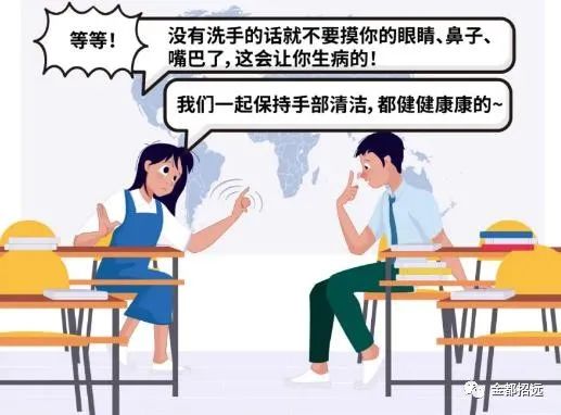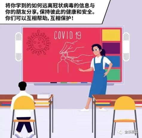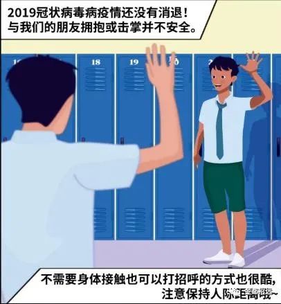在學校時記得與同學、老師保持人際距離,不需要身體接觸也可以打招呼的方式也很酷。記得用肥皂或洗手液和清水勤洗手,在吃飯前、上廁所后、運動或身體活動后都要洗手。