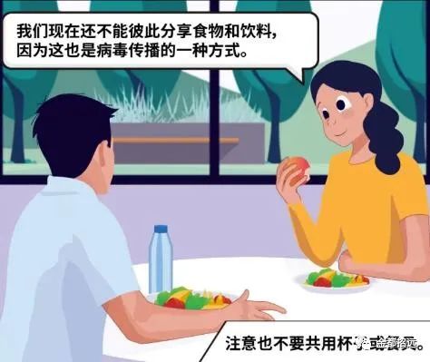 雖然還沒有證據(jù)表明食用食物有感染新型冠狀病毒的風險,但為了安全起見,現(xiàn)在最好不要彼此分享食物和飲料。也不要共用杯子和餐具。從可靠的來源來獲取信息,將你學到的如何遠離冠狀病毒的信息與你的朋友分享。