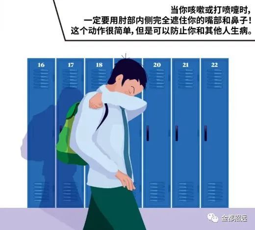 注意呼吸道禮儀,當你咳嗽或打噴嚏時,用肘部內(nèi)側(cè)遮住你的嘴部和鼻子。沒有洗手不要摸你的眼睛、鼻子、嘴巴,否則可能將病毒接觸傳播到這些部位。保持手部清潔。