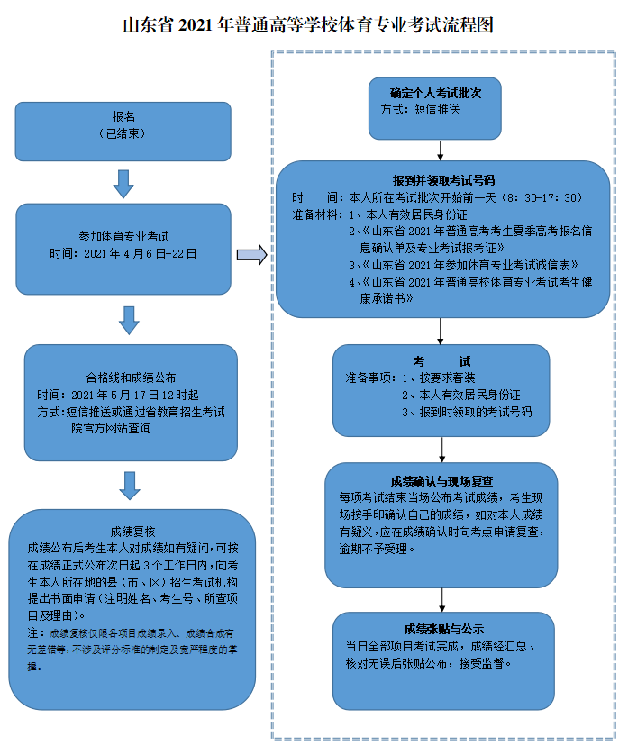參加體育專業(yè)考試考生有哪些注意事項(xiàng)?一是保持高考報(bào)名時(shí)的電話通訊暢通,省教育招生考試院會(huì)在考生所在批次開(kāi)考前推送考生本人具體考試時(shí)間安排短信,在5月17日12時(shí)起推送考生體育專業(yè)考試成績(jī)短信;二是考生須在個(gè)人所在考試批次開(kāi)始前一天報(bào)到,報(bào)到時(shí)需攜帶材料包括:2.《山東省2021年普通高考考生夏季高考報(bào)名信息確認(rèn)單及專業(yè)考試報(bào)考證》(高考報(bào)名時(shí)現(xiàn)場(chǎng)確認(rèn)階段領(lǐng)取);3.《山東省2021年參加體育專業(yè)考試誠(chéng)信表》和《山東省2021年普通高校體育專業(yè)考試考生健康承諾書(shū)》(山東省教育招生考試院官網(wǎng)《山東省教育廳關(guān)于做好山東省2021年普通高等學(xué)校體育專業(yè)招生有關(guān)工作的通知》文件附件中下載打印);三是每項(xiàng)考試結(jié)束當(dāng)場(chǎng)公布考試成績(jī),考生需要現(xiàn)場(chǎng)按手印確認(rèn)自己的成績(jī)。請(qǐng)考生認(rèn)真核對(duì)自己的成績(jī),確認(rèn)無(wú)誤后方可按手印,不要草率確認(rèn)。如有異議,應(yīng)在成績(jī)確認(rèn)時(shí)向考點(diǎn)申請(qǐng)復(fù)查。四是考生在參加考試期間要自覺(jué)遵守防疫要求,須自覺(jué)接受體溫檢測(cè),全程佩戴口罩(考生在核驗(yàn)身份或考試過(guò)程中除外),保持安全距離,減少人員聚集,服從現(xiàn)場(chǎng)工作人員管理及防疫工作安排。五是成績(jī)正式公布后考生本人對(duì)成績(jī)?nèi)缬幸蓡?wèn),可在成績(jī)正式公布次日起3個(gè)工作日內(nèi),向考生本人所在地的縣(市、區(qū))招生考試機(jī)構(gòu)提出書(shū)面申請(qǐng)(注明姓名、考生號(hào)、所查項(xiàng)目及理由)。成績(jī)復(fù)核僅限各項(xiàng)目成績(jī)錄入、成績(jī)合成有無(wú)差錯(cuò)等,不涉及評(píng)分標(biāo)準(zhǔn)的制定及寬嚴(yán)程度的掌握。在專業(yè)考試中被認(rèn)定為違規(guī)的考生,按照《國(guó)家教育考試違規(guī)處理辦法》(教育部令第33號(hào))和有關(guān)規(guī)定嚴(yán)肅處理。考點(diǎn)將采取多種監(jiān)測(cè)手段對(duì)考生報(bào)考資格進(jìn)行復(fù)核,加強(qiáng)考生身份驗(yàn)證,有代替他人或者讓他人代替自己參加考試違規(guī)行為的考生,除給予“報(bào)名參加考試的各階段、各科成績(jī)無(wú)效”的處理外,同時(shí)根據(jù)《中華人民共和國(guó)刑法修正案(九)》,被依法追究刑事責(zé)任。對(duì)使用興奮劑,以不正當(dāng)手段獲得或者試圖獲得考試成績(jī)的行為的考生,認(rèn)定為在考試過(guò)程中作弊,根據(jù)《國(guó)家教育考試違規(guī)處理辦法》,給予“報(bào)名參加考試的各階段、各科成績(jī)無(wú)效”的處理,情節(jié)嚴(yán)重的,由教育行政部門責(zé)令停止參加相關(guān)國(guó)家教育考試一年以上三年以下。