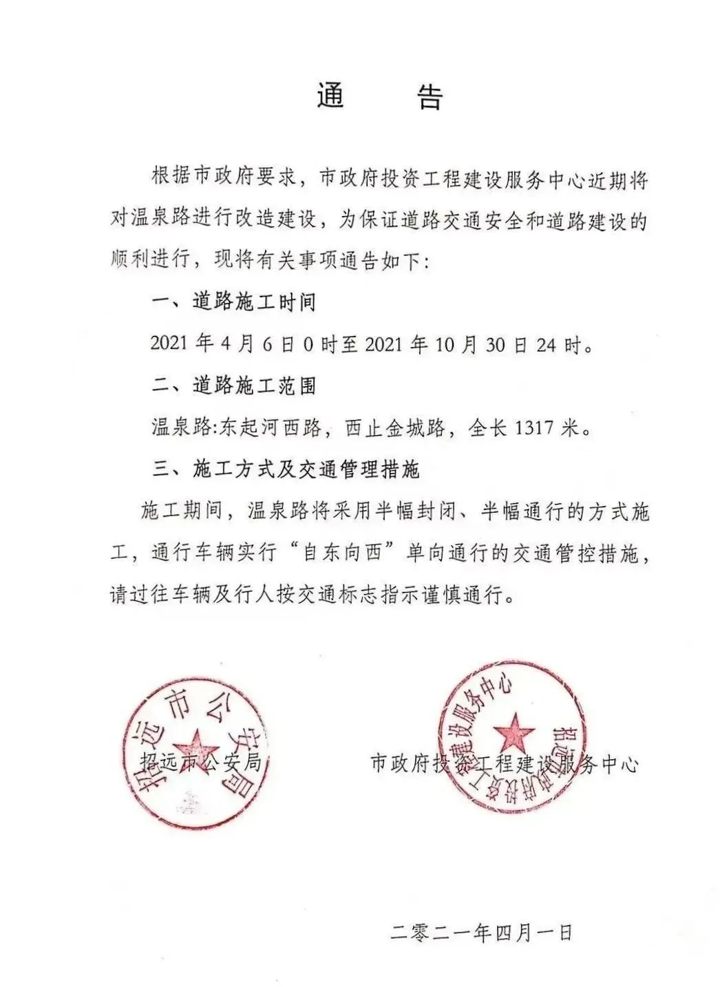根據(jù)市政府要求,市政府投資工程建設(shè)服務(wù)中心近期將對溫泉路進(jìn)行改造建設(shè),為保證道路交通安全和道路建設(shè)的順利進(jìn)行,現(xiàn)將有關(guān)事項(xiàng)通告如下: