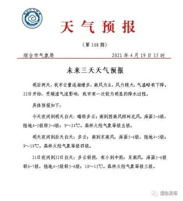 21日夜間到22日白天:多云轉(zhuǎn)陰,有小到中雨;東南風(fēng),海面5-6級(jí)轉(zhuǎn)6-7級(jí),陸地4-5轉(zhuǎn)5-6級(jí);10~15℃。森林火險(xiǎn)氣象等級(jí)三級(jí)。
