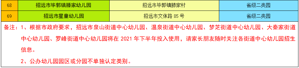 您好!“幼有所育、幼有優(yōu)育”,讓每個(gè)孩子都能享有公平而有質(zhì)量的學(xué)前教育,需要全社會(huì)的共同努力。近年來(lái),招遠(yuǎn)市委、市政府高度重視學(xué)前教育,不斷加大學(xué)前教育財(cái)政投入,想方設(shè)法擴(kuò)增優(yōu)質(zhì)普惠學(xué)前教育資源,快速推進(jìn)五所街道公辦中心園建設(shè),認(rèn)定了一批普惠性民辦幼兒園,大大滿足區(qū)域幼兒入園需求。一年一度的幼兒園招生工作已經(jīng)開始,為孩子創(chuàng)造一個(gè)安全的教育環(huán)境是我們共同的心愿和責(zé)任,希望各位家長(zhǎng)從孩子身心健康和生命安全出發(fā),理智選擇。為了讓孩子在安全、快樂(lè)的環(huán)境中健康成長(zhǎng),招遠(yuǎn)市教育和體育局提醒家長(zhǎng)朋友在為孩子選擇幼兒園時(shí)注意以下事項(xiàng):一、明確招生方式和招生原則。幼兒園招生堅(jiān)持就近就便、免試入園的原則,各類幼兒園實(shí)行學(xué)年初(秋季)一次性招生,具體招生時(shí)間由各幼兒園自行確定。一般每年1-4月份幼兒園發(fā)布招生簡(jiǎn)章,8月下旬前完成招生工作,幼兒園平時(shí)如有空余學(xué)位,可隨時(shí)補(bǔ)招。二、認(rèn)真了解幼兒園辦園資質(zhì)。為給孩子選擇一所能讓“孩子安心、家長(zhǎng)放心”的幼兒園,家長(zhǎng)朋友在為孩子選擇幼兒園時(shí),一定要仔細(xì)了解幼兒園辦園資質(zhì),查看幼兒園有關(guān)證件是否齊全。目前,我市共有證照齊全且年檢合格的合法幼兒園69處(名單附后)。望家長(zhǎng)朋友們不要被非法幼兒園誤導(dǎo),非法園普遍存在無(wú)辦園許可證、管理不規(guī)范、疫情防控措施不到位、無(wú)食品經(jīng)營(yíng)許可證、缺乏市場(chǎng)監(jiān)管部門對(duì)食品安全監(jiān)管、安保及園舍安全不達(dá)標(biāo)等問(wèn)題,孩子們飲食安全和人身安全無(wú)法保證,存在諸多危及幼兒安全的隱患,同時(shí)非法園還存在退費(fèi)難、出現(xiàn)糾紛維權(quán)難等突出問(wèn)題。希望各位家長(zhǎng)從孩子的安全、身心健康和快樂(lè)成長(zhǎng)著想,一定要選擇有辦園許可證且經(jīng)過(guò)有關(guān)部門核驗(yàn)合格的合法幼兒園。 三、做到統(tǒng)籌兼顧,理性擇園。保教質(zhì)量和管理水平是保證孩子健康成長(zhǎng)的根本。在為孩子選擇幼兒園時(shí),家長(zhǎng)一定要親自到幼兒園現(xiàn)場(chǎng)查看辦園許可證、食品經(jīng)營(yíng)許可證等證件,了解幼兒園的辦園條件和保教質(zhì)量,確保孩子吃的好、玩的好、學(xué)的好,能夠安全健康快樂(lè)地成長(zhǎng)。親愛(ài)的家長(zhǎng)朋友,幼兒身心健康、快樂(lè)成長(zhǎng)是你我共同的心愿,也是教育人持之以恒的奮斗目標(biāo)。時(shí)光不語(yǔ),靜待花開。讓我們攜手并肩、同心協(xié)力,為規(guī)范我市幼兒園發(fā)展,營(yíng)造幼兒健康成長(zhǎng)的良好環(huán)境努力前行!幼兒園違規(guī)招生舉報(bào)電話:8255511 (證照齊全且經(jīng)過(guò)開園核驗(yàn)合格的)點(diǎn)擊圖片↓可查看大圖