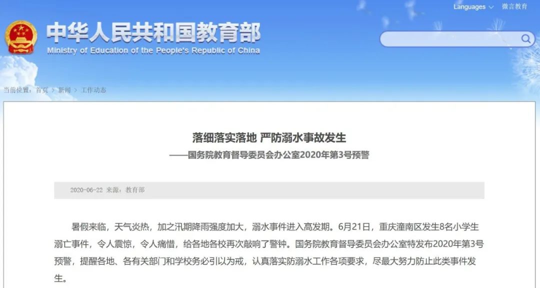 全宇宙只有不到1%的人點(diǎn)擊上方進(jìn)入招遠(yuǎn)信息港你真是個(gè)特別的人6月22日,國(guó)務(wù)院教育督導(dǎo)委員會(huì)辦公室2020年第3號(hào)預(yù)警發(fā)布!要求嚴(yán)防溺水事故發(fā)生!↓↓↓圖源:教育部官網(wǎng)落細(xì)落實(shí)落地嚴(yán)防溺水事故發(fā)生——