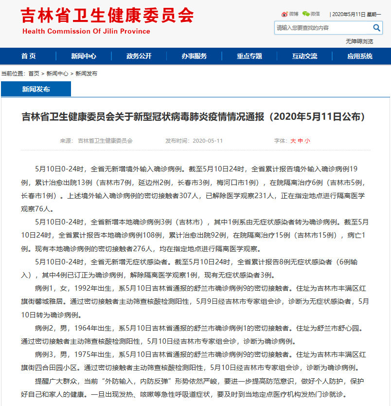 全宇宙只有不到1%的人點擊上方進入招遠信息港你真是個特別的人據(jù)吉林省衛(wèi)生健康委員會通報,5月10日0-24時,吉林全省新增本地確診病例3例(吉林市),其中1例系由無癥狀感染者轉(zhuǎn)為確診病例。病例1,女,