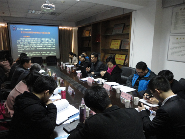 2015年3月19日,淮南市住房融資擔(dān)保中心主任王瑞西一行來到安慶市房屋置業(yè)擔(dān)保公司調(diào)研,雙方就縣域擔(dān)保分公司管理、市場性新業(yè)務(wù)拓展以及住房公積金貸款擔(dān)保行收費(fèi)新模式進(jìn)行了交流溝通。